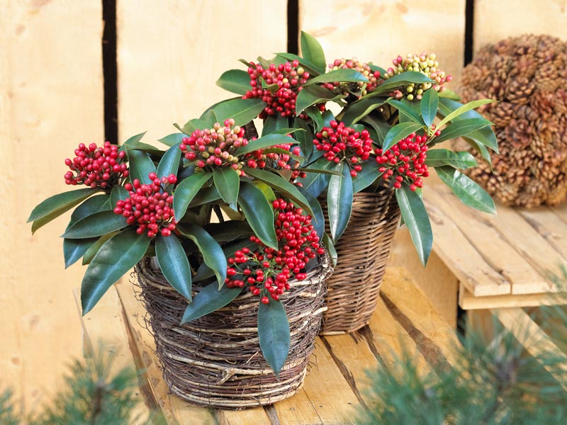 Kleiner, immergrüner Strauch für Kübel und Beete, Blütezeit April bis Mai, ab Oktober dekorative, rote Beeren.