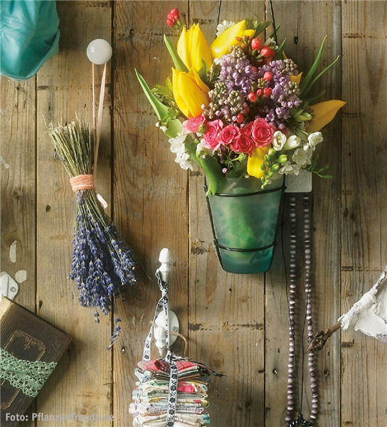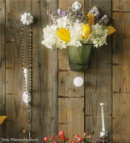 Für die Künstler unter uns – gestalten Sie eine Wand mit liebevollen Dingen. Das geht ganz einfach: Platzieren Sie unterschiedliche Griffe an der Wand und hängen Sie hübsche Vasen mit Blumen daran auf.