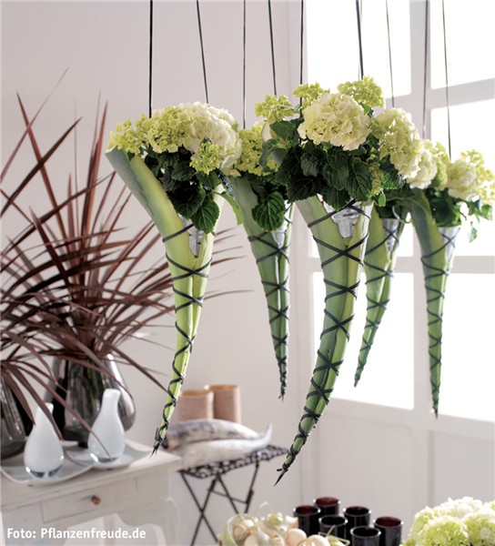 Diese Idee bringt nicht nur Farbe in die Wohnung, Sie überbringen mit Rosen (Rosa) und Hortensien (Hydrangea) eine extra Portion Bewunderung und Liebe. Toll wirken Vasen auch von einer Decke oder an einem Ast hängend.