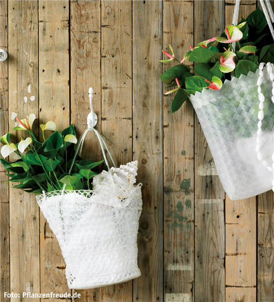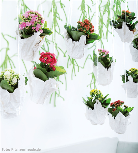 Ein guter Partner für hängende Töpfe ist die pflegeleichte Kalanchoe, oder auch Flammendes Käthchen (Kalanchoe blossfeldiana) genannt, mit ihren unzählig schönen Miniblüten. Sie ist die ideale Blühpflanze für Mütter, die nicht so viel Zeit für die Pflege haben.