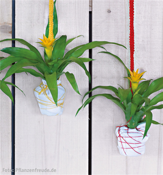 Den ausdrucksstarken Trompetenblüten der Guzmanie (Guzmania) werden glücksbringende Eigenschaften nachgesagt. Der Legende nach sammelt ihr Trichter alle Gaben des Himmels. Schenken Sie eine Variante in Gelb, denn diese Farbe steht für Glück – wovon Mama nie genug haben kann. Selbstverständlich können Sie auch den Klassiker, eine hübsche Topf-Rose (Rosa-Hybride), verschenken. Ideal dafür eignen sich Pflanzherzen, ergänzt mit lieblichen Herzanhängern.