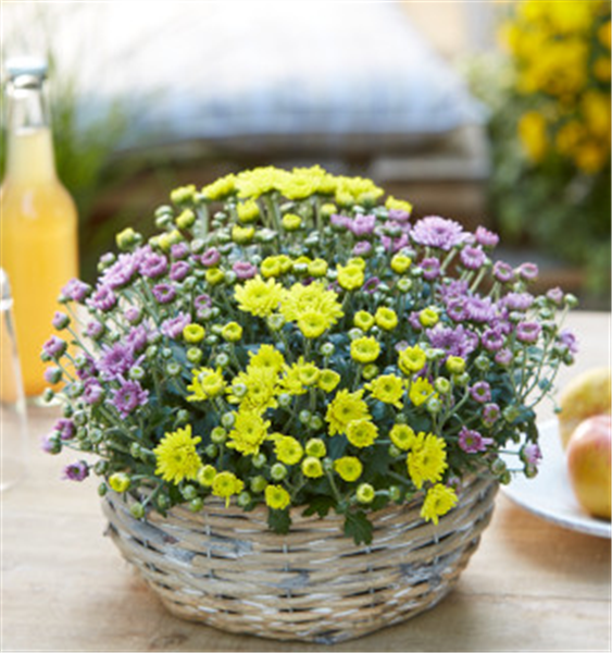 Mit ihren kunterbunten Blüten bringen Chrysanthemen (Chrysanthemum indicum) ordentlich Farbe vor die Tür. Die buschig wachsenden Pflanzen tragen gefüllte oder halbgefüllte Blüten und kommen solo im Kübel sehr gut zur Geltung. Für eine reiche Blütenfülle sollten Sie die Chrysantheme an einen hellen, geschützten Eingangsbereich stellen. Bei Frost muss die zurückgeschnittene Pflanze sofort in ihr Winterquartier ziehen, sie ist sehr frostempfindlich.