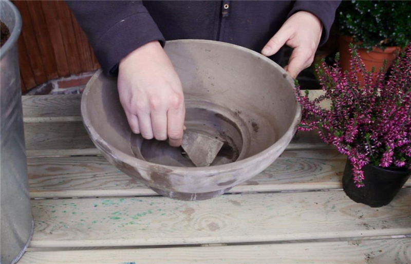 Legen Sie über das Abzugsloch der Pflanzschale eine Tonscherbe.