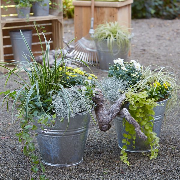 Zu Heide und Chrysantheme gesellen sich jeweils im passenden Farbschema schnellwüchsige Stauden wie Günsel (Ajuga reptans) oder das Pfennigkraut (Lysimachia nummularia). Die Vertikale wird im Handumdrehen mit auflockernden Seggen (Carex morowii & Carex brunnea) betont. Einen tollen Auftritt haben auch die edlen, silberlaubigen Herbstpflanzen wie das Texasgras (Calocephalus brownii) oder das Silberblatt *(Senecio cineraria).*