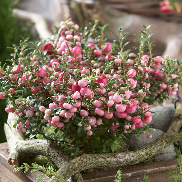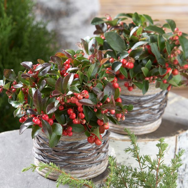 Kugeligen Fruchtschmuck in Rosa, Pink, Lila oder Weiß zeigt die Torfmyrte (Pernettya mucronata) an ihren Triebenden frühestens ab August, der den Winter über am Strauch bleibt. Da es sich um eine zweihäusige Pflanze handelt, sind männliche und weibliche Pflanzen notwendig, damit sich Beeren bilden. Ursprünglich stammt der immergrüne Strauch aus Südamerika. Jung- bzw. Topfpflanzen benötigen einen Winterschutz. Genauso attraktiv sieht die Scheinbeere (Gaultheria procumbens) aus, mit ihren leuchtenden Beeren in Rot, Rosa oder Weiß. Sie eignet sich besonders als Bodendecker in luftiger, saurer Erde. Gießen Sie am besten mit kalkarmen Regenwasser.