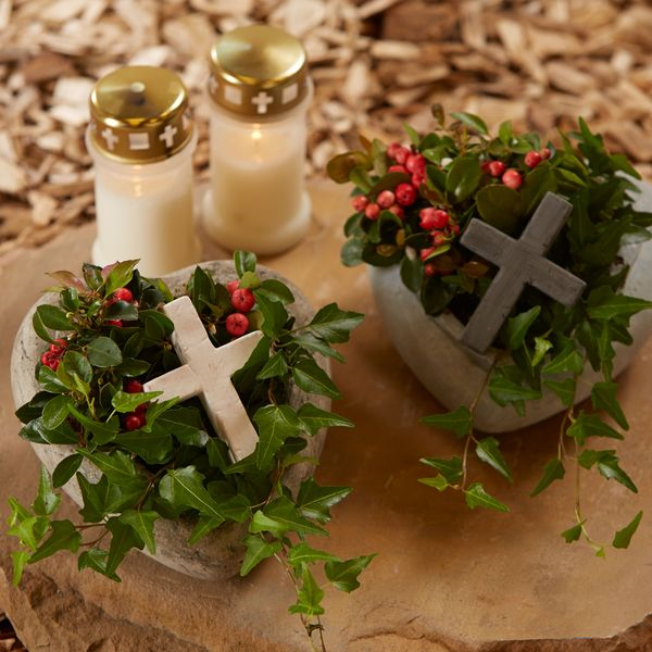 Pflanzherzen bepflanzt mit roter Scheinbeere (Gaultheria procumbens) und Efeu (Hedera) sorgen für schöne Kontraste.