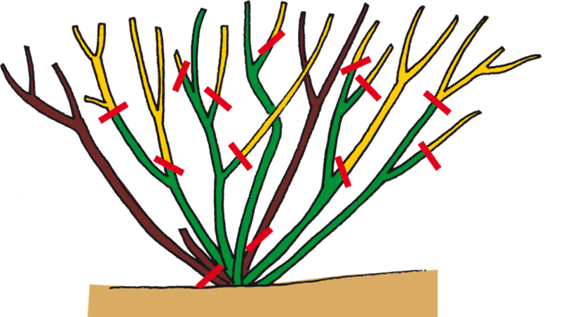 Sie werden ähnlich den Strauchrosen geschnitten; wie diese weniger streng, um ihren buschigen Wuchs und damit ihre sommerliche Anmutung weitestgehend zu erhalten.