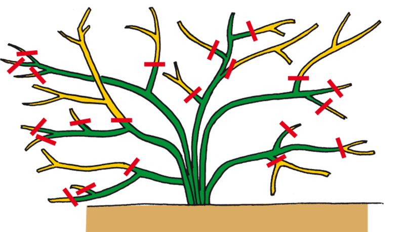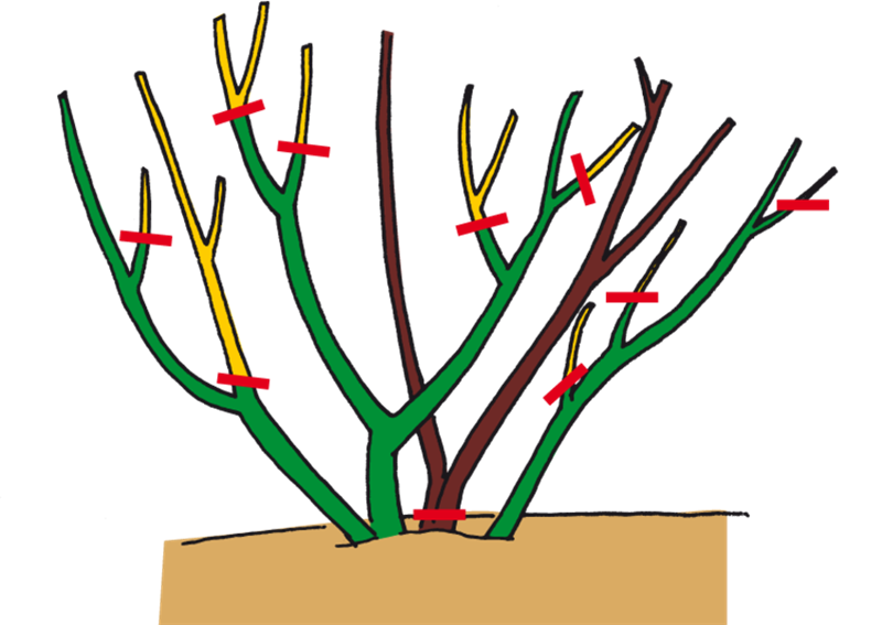 Alte, dicke Triebe können an der Pflanze verbleiben, solange sie noch gut blühen. Lässt die Blühkraft nach, die alten Triebe zugunsten jüngerer herausschneiden. Seitentriebe auf drei bis fünf Augen einkürzen – hier entstehen die jungen Blütentriebe.