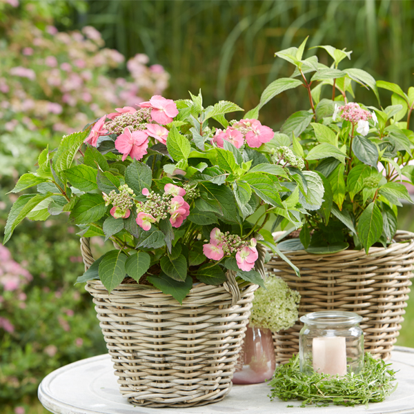 Die wohl bekannteste Hortensienart ist die Bauernhortensie (Hydrangea macrophylla). Sie wurde Ende des 18. Jh. von Japan nach Europa gebracht. Niemand möchte sie aufgrund der romantischen, bunten Blüten im Garten missen. Ihre üppigen Blütenkugeln zeigen sich in den Farben Blau, Rosa, Rot, Rotpink oder Weiß. Eine der beliebtesten Sorten ist *'Endless Summer®'*, da diese die Fähigkeit besitzt, bereits an frischen Trieben Blüten zu bilden. Die großen Dolden des bis zu 2 m hohen Halbstrauches blühen von Juni bis Oktober. Die pflegeleichte und wuchsfreudige Pflanze fühlt sich im nährstoffreichen Boden am wohlsten. Überwintern Sie die Gartenhortensie mit Reisig oder einer Vlieshaube. Im Topf eingepflanzte Hortensien überwintert man am besten in einer ungeheizten Garage.