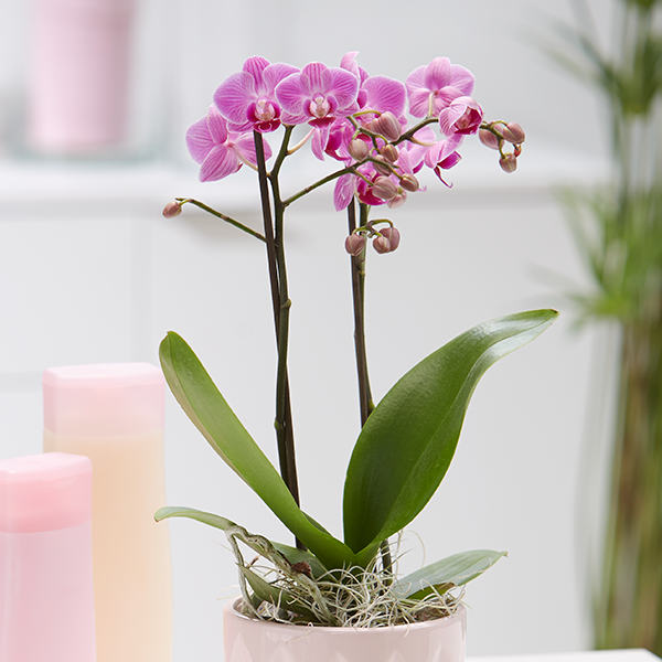 Die Phalaenopsis ist nicht nur die Königin der Tropen, sondern mittlerweile auch der Zimmerpflanzen. Es gibt sie in einer enormen Farbvielfalt, die nicht nur in der grauen Winterzeit begeistert. Sie ist pflegeleicht und daher bestens für Orchideen-Einsteiger geeignet. Phalaenopsis wachsen im tropischen Regenwald auf Bäumen und versorgen sich über Luftwurzeln. Als Zimmerpflanze mögen sie weder Staunässe, zu viel Dünger, noch pralle Sonne. An einem hellen Standort bei 18 - 25 °C gedeihen sie am besten. Schnellt das Thermometer im Sommer auf 30 °C hoch, macht ihr das auch nichts aus.