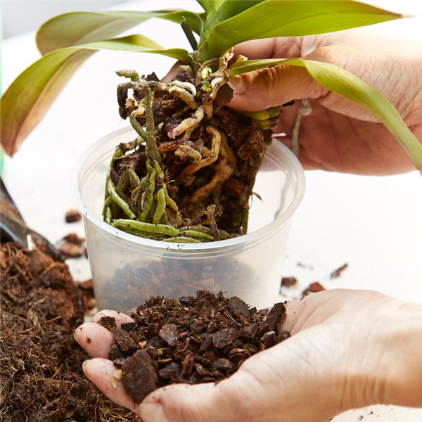 • Orchidee (mit leicht drehender Bewegung) in den neuen Topf setzen