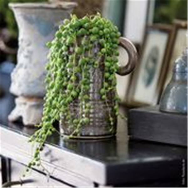 Die Erbsenpflanze (Senecio herreanus) hat eine ganz besondere Ästhetik. Ihre kleinen Blätter sind wie winzige Kugeln. Daher auch ihr populärer Name „Erbsenpflanze“. Stellen Sie sie an einen hellen Standort und genießen die elegante Wirkung.
